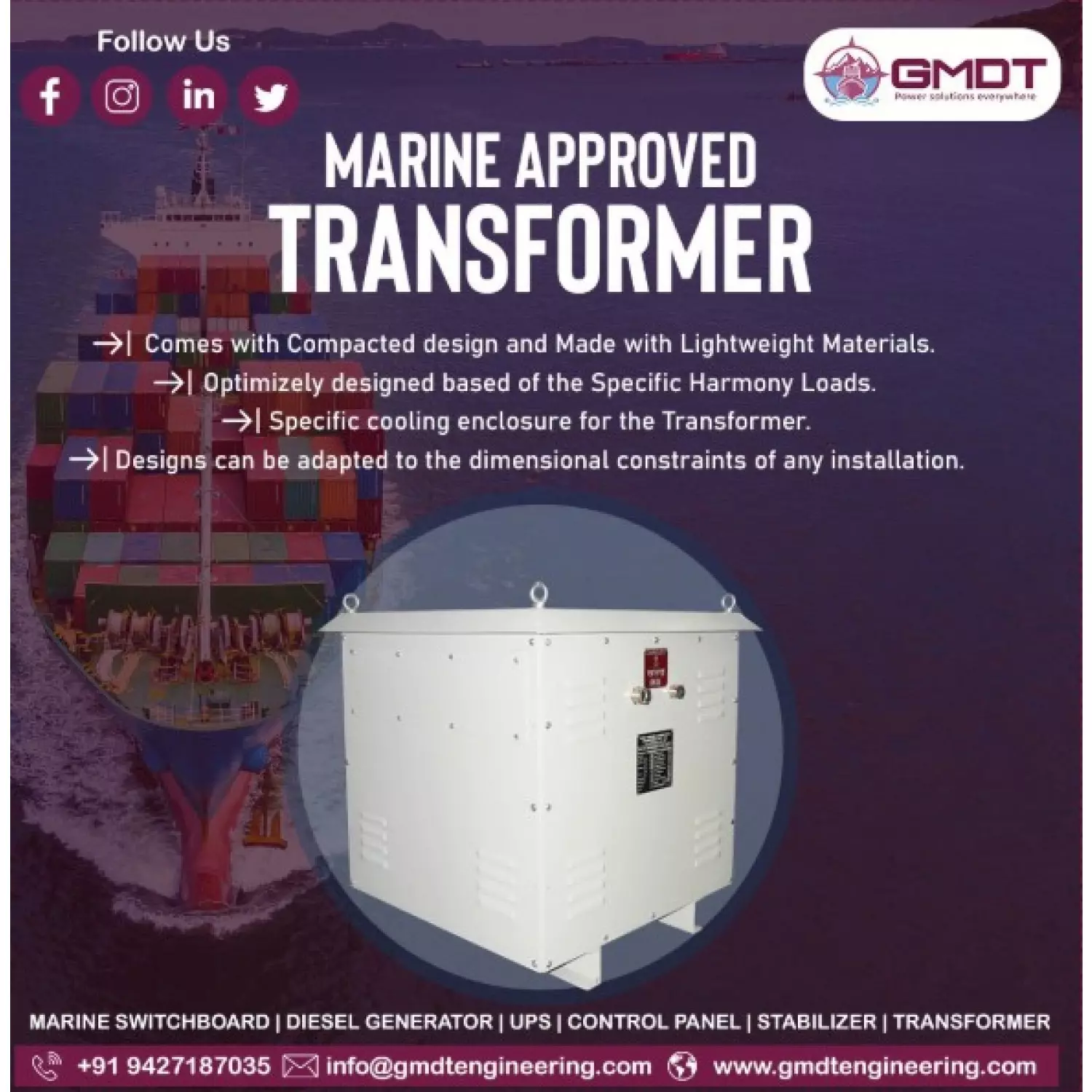 🔹 Isolation Marine Transformers 🔹 Step-Up / Step-Down Transformers 🔹 Marine Distribution Transformers 🔹 Auto Transformers 🔹 Shore Connection Transformers 🔹 Custom Marine Transformers